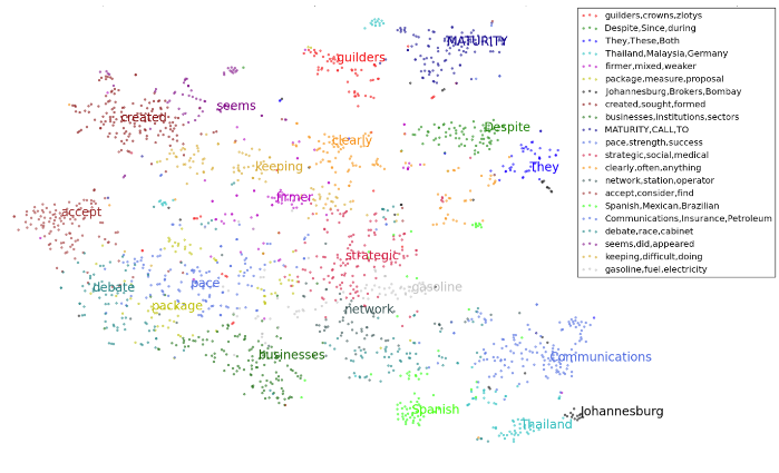 The image above shows an automatic type clustering of words. Each cluster centroid is labeled with the closest word in embedding space. At this high level, we apparently see the separation of nouns, verbs, adjectives, and proper nouns, along with some finer topical distinctions. By repeating this process with higher-resolution clusterings, we obtain a latent hierarchy of subtypes such as the way the set of proper nouns contains the set of location names, which in turn contains names of countries and cities, and so forth. This same technique will be very useful in automated ontology generation.