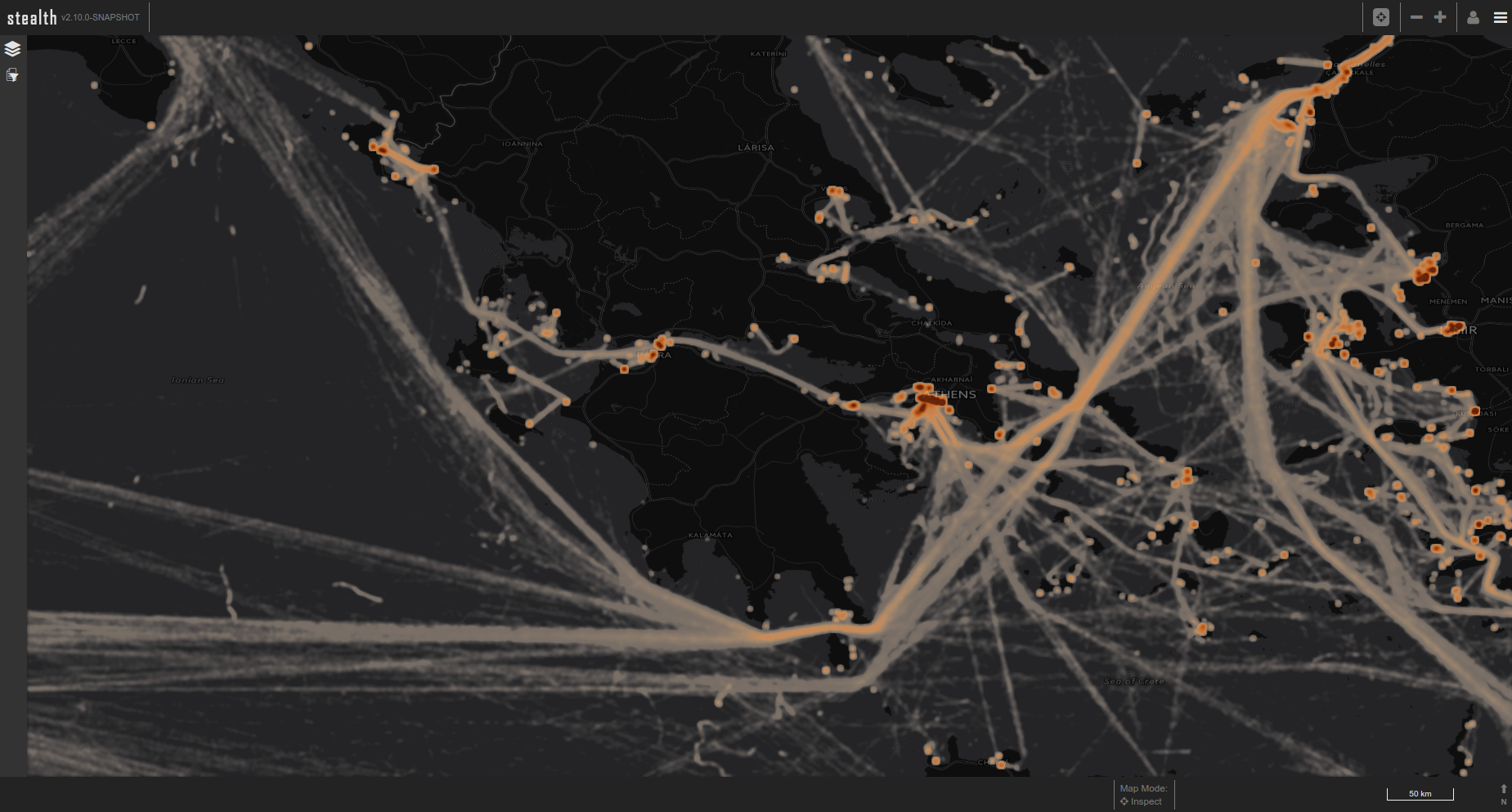 Now we can start to see transit lanes and other larger patterns in the data. There’s a lot of ship traffic in the Mediterranean. We can also use GeoMesa’s Web Processing Service (WPS) tools to visualize histograms of various attributes. In Stealth, we have wired this into a visual control that allows a user to drag a box and compare attribute counts in different spatial regions.